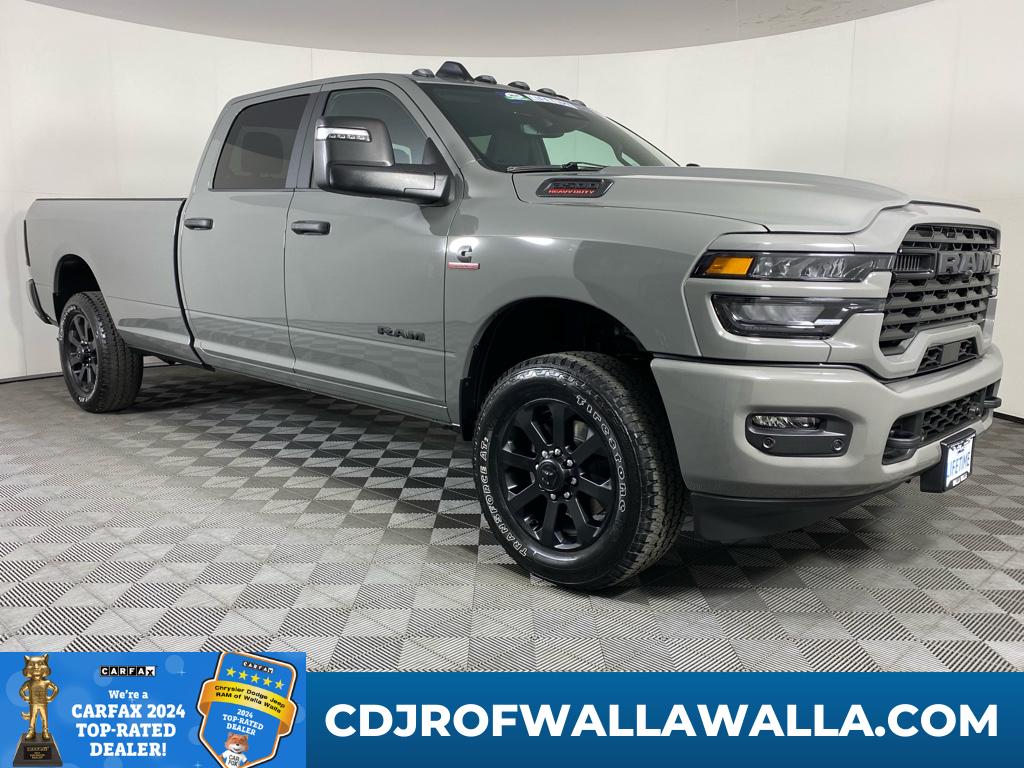 Quick Order Package 24Z Big Horn. Cold Weather Group: Engine Block Heater; MOPAR Winter Front Grille Cover. Night Edition. Big Horn Level 1 Plus Equipment Group: Google Android Auto; SiriusXM Radio Service; For Details Visit DriveUconnect.com; For More Info. Call 800-643-2112; Integrated Voice Command with Bluetooth; Emergency Vehicle Alert System (EVAS); 12 Touchscreen Display; Glove Box Lamp; Auto Power-Folding Mirrors; Footwell Courtesy Lamp; Mirror Running Lights; MOPAR Deployable Bed Step; Alexa Built-In; Apple CarPlay; Power-Adjustable Convex Aux Mirrors; Forward and Reverse Utility Lights; Locking Lower Glove Box; Remote Start System; 9 Alpine Speakers with Subwoofer; Disassociated Touchscreen Display; Dual Glove Boxes; 2nd Row in Floor Storage Bins; Rear View Auto Dim Mirror; Rear Dome with On/off Switch Lamp; LED Bed Lighting; Connectivity - US/Canada; GPS Navigation; 4G LTE Wi-Fi Hot Spot; GPS Antenna Input; Exterior Mirrors with Heating Element; SiriusXM with 360L; Global Telematics Box Module; Connected Travel and Traffic Services; Foam Bottle Insert (door Trim Panel); Black Exterior Mirrors; Big Horn Instrument Panel Badge; Off-Road Information Pages; Selectable Tire Fill Alert; Trailer Tow Pages; HD Radio; Uconnect 5 Navigation with 12.0 Display Radio; Power Heated Fold Telescopic Mirrors; Exterior Mirrors with Supplemental Signals; Steering Wheel Mounted Audio Controls; Exterior Mirrors Courtesy Lamps; Air Conditioning ATC with Dual Zone Control; MOPAR Spray in Bedliner; Power Adjust Mirrors; Luxury Steering Wheel; Power Telescoping Mirrors. Heated Seats and Wheel Group: Heated Front Seats; Heated Steering Wheel. Quick Order Package 2UZ Big Horn. 5th Wheel/gooseneck Towing Prep Group. Premium Cloth Bucket Seats. 50 Gallon Fuel Tank. Remote Start System. Instrument Panel Mounted Auxiliary Switches. MOPAR Front and Rear Rubber Floor Mats. Rear Wheelhouse Liners. Clearance Lamps. Power 2-Way Driver Lumbar Adjust. **Equipment listed is based on original vehicle build and subject to change. Please confirm the accuracy of the included equipment by calling the dealer prior to purchase.**