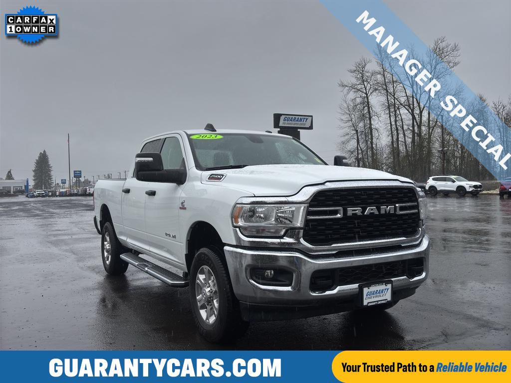 2023 Ram 2500 Big Horn 6.7L Cummins Diesel, 4WD, 46,576 miles. This rugged, CARFAX 1-Owner truck pairs proven diesel performance with Big Horn comfort and capability, now available in Junction City, OR at the best price. The 6-cylinder 6.7L turbo diesel delivers exceptional low-end torque for towing and hauling, while the 4WD system provides confidence on work sites and off-road routes. Low mileage and single-owner history make this Ram 2500 a smart, reliable choice for contractors, ranchers, and drivers who demand durability. Inside, the Big Horn cabin balances utility and convenience with a modern infotainment suite including Apple CarPlay and Satellite Radio plus XM Radio for extended listening options. A back-up camera enhances maneuvering and safety when towing trailers or navigating tight lots. Heavy-duty suspension and robust towing equipment are built to handle demanding jobs, and the diesel engine is engineered for long service intervals and strong resale value. This 2023 Ram 2500 Big Horn stands out for its combination of diesel power, 4WD capability, and trusted ownership history. Priced to move the best price in Junction City, OR it represents excellent value for buyers seeking a dependable workhorse with contemporary tech features. Schedule a test drive and see why this Ram 2500 is the smart pickup choice.
